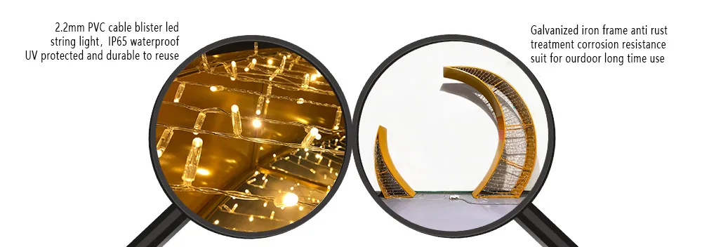 The construction includes a durable metal iron frame (stove varnished for rust protection) and high-quality PVC blister string lights with 100% copper wire.
